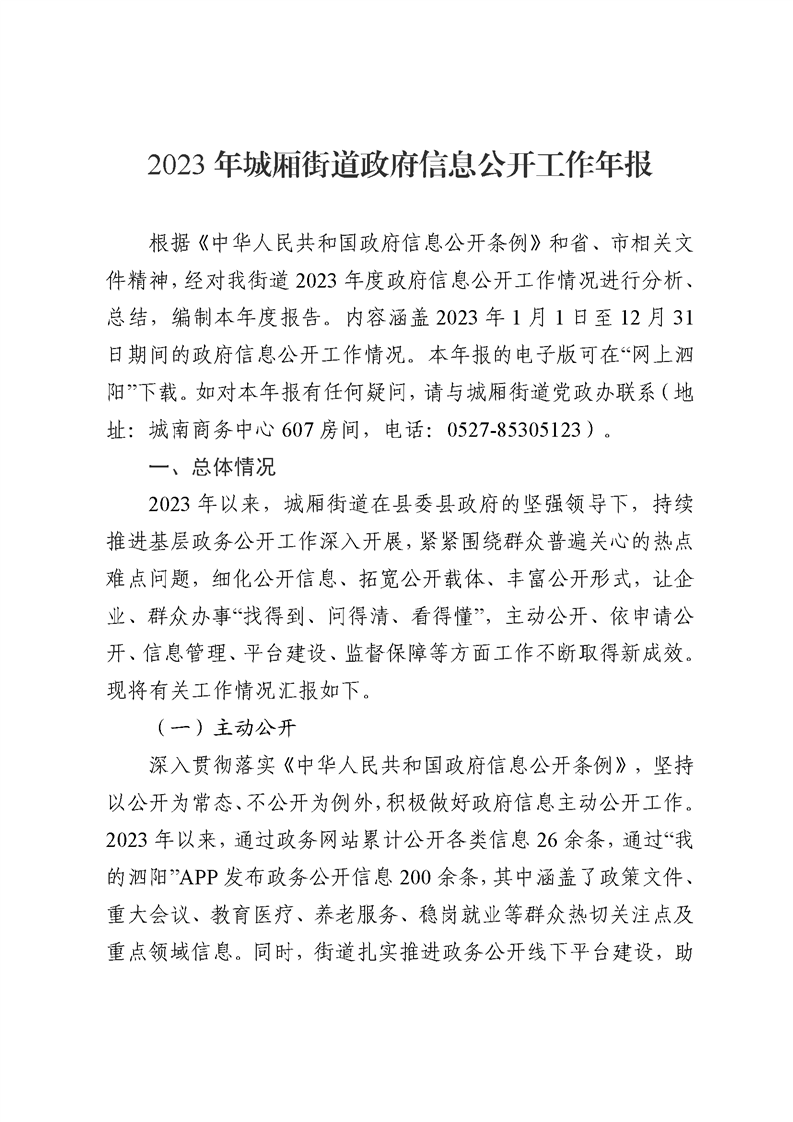 泗陽縣城廂街道辦事處2023年政府信息公開工作年度報告