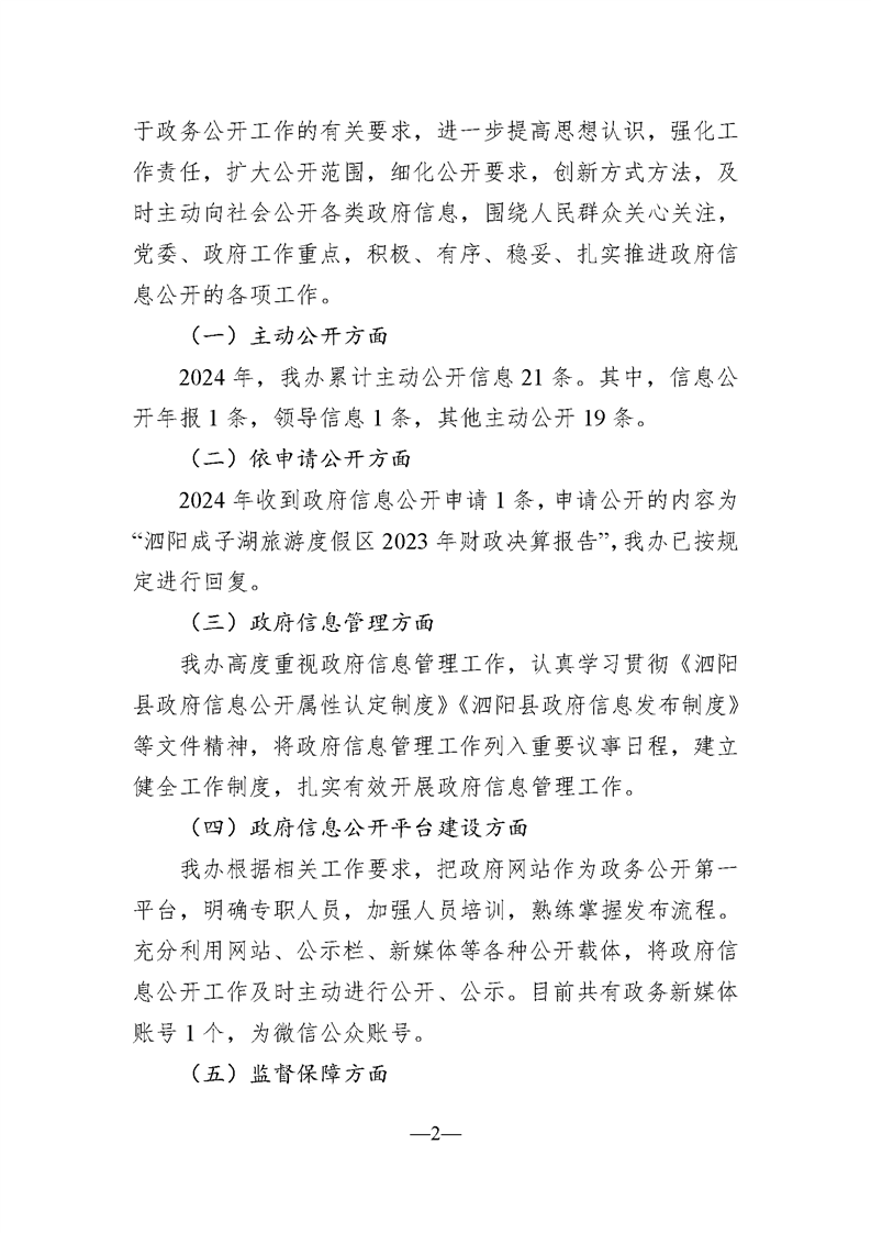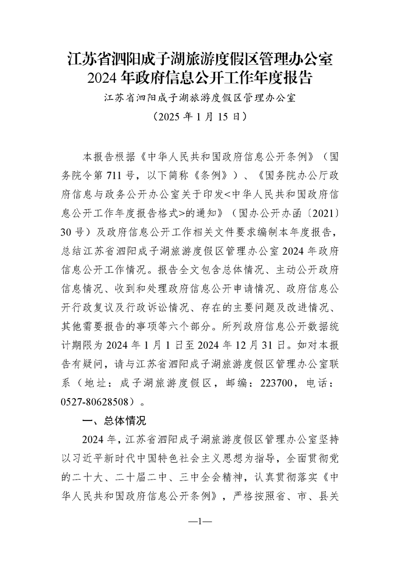 江蘇省泗陽成子湖旅游度假區管理辦公室2024年政府信息公開工作年度報告