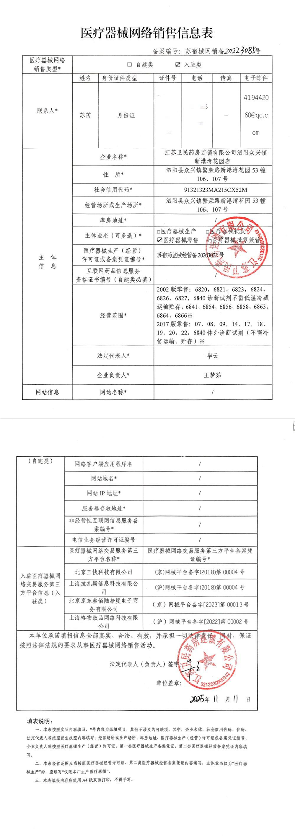 醫療器械網絡銷售:江蘇衛民藥房連鎖有限公司泗陽眾興鎮新港灣花園店