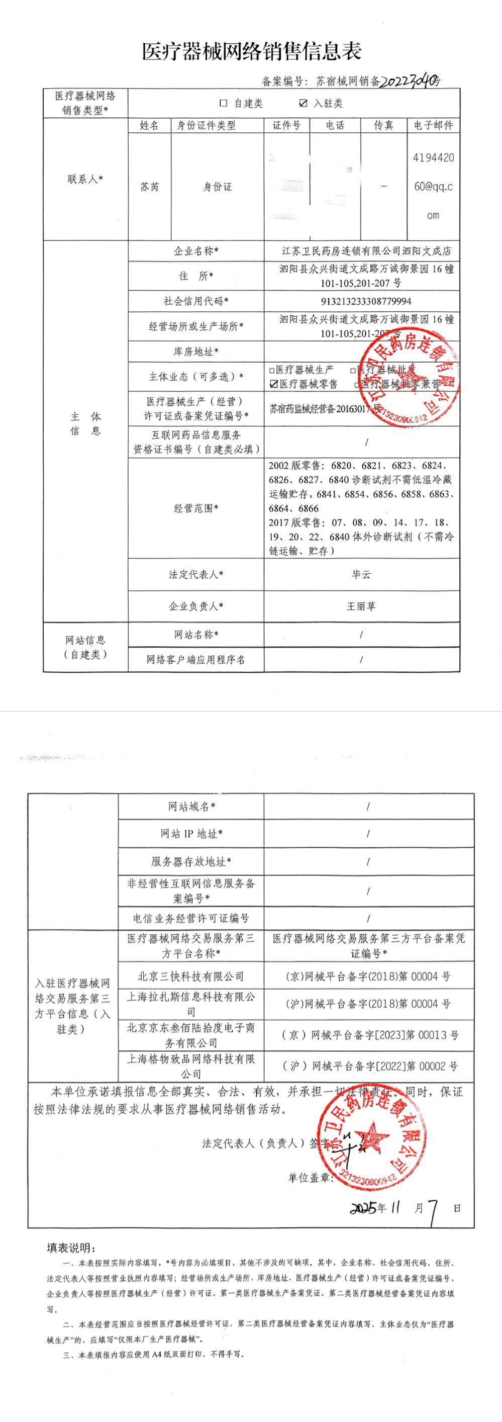 醫(yī)療器械網(wǎng)絡(luò)銷售:江蘇衛(wèi)民藥房連鎖有限公司泗陽文成店