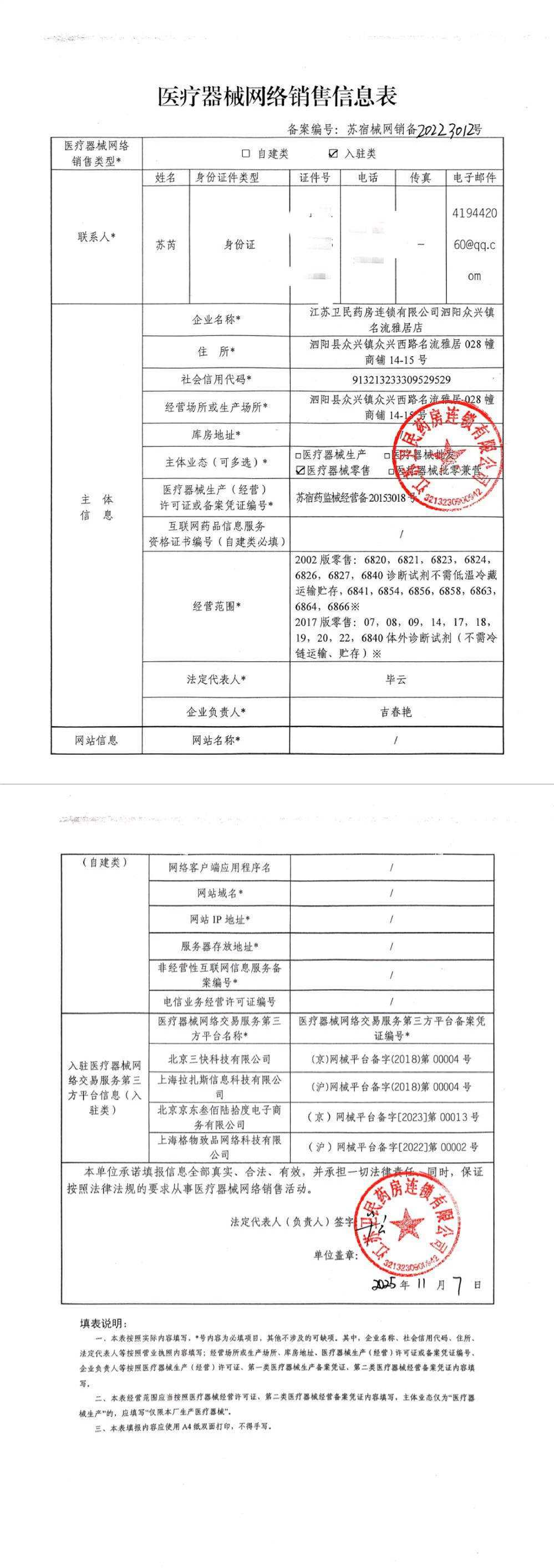 醫療器械網絡銷售:江蘇衛民藥房連鎖有限公司泗陽眾興鎮名流雅居店