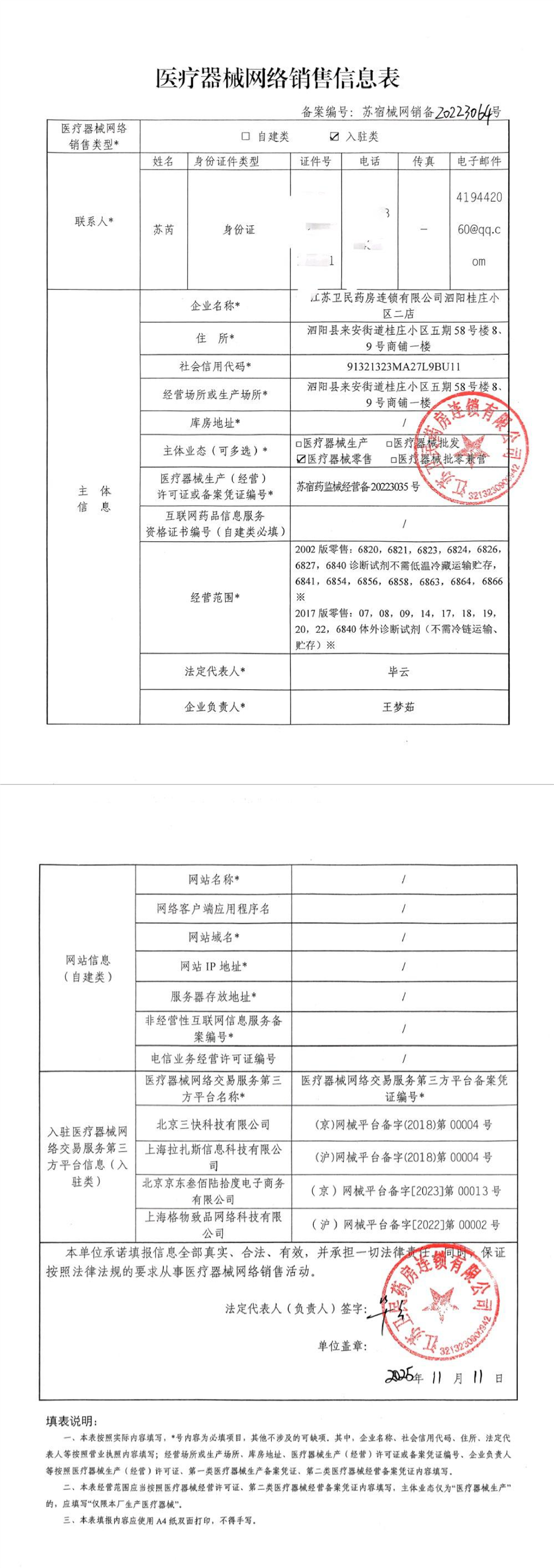 醫療器械網絡銷售:江蘇衛民藥房連鎖有限公司泗陽桂莊小區二店