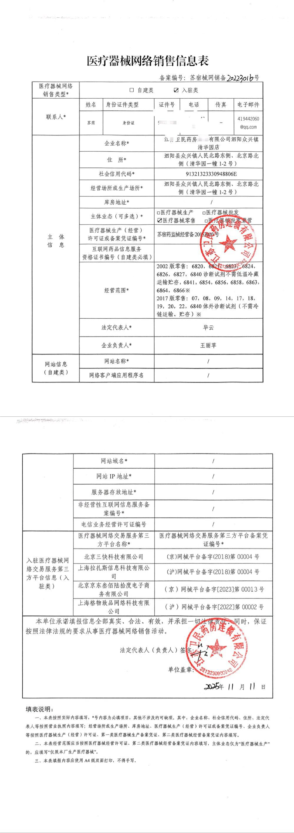 醫療器械網絡銷售:江蘇衛民藥房連鎖有限公司泗陽眾興鎮清華園店