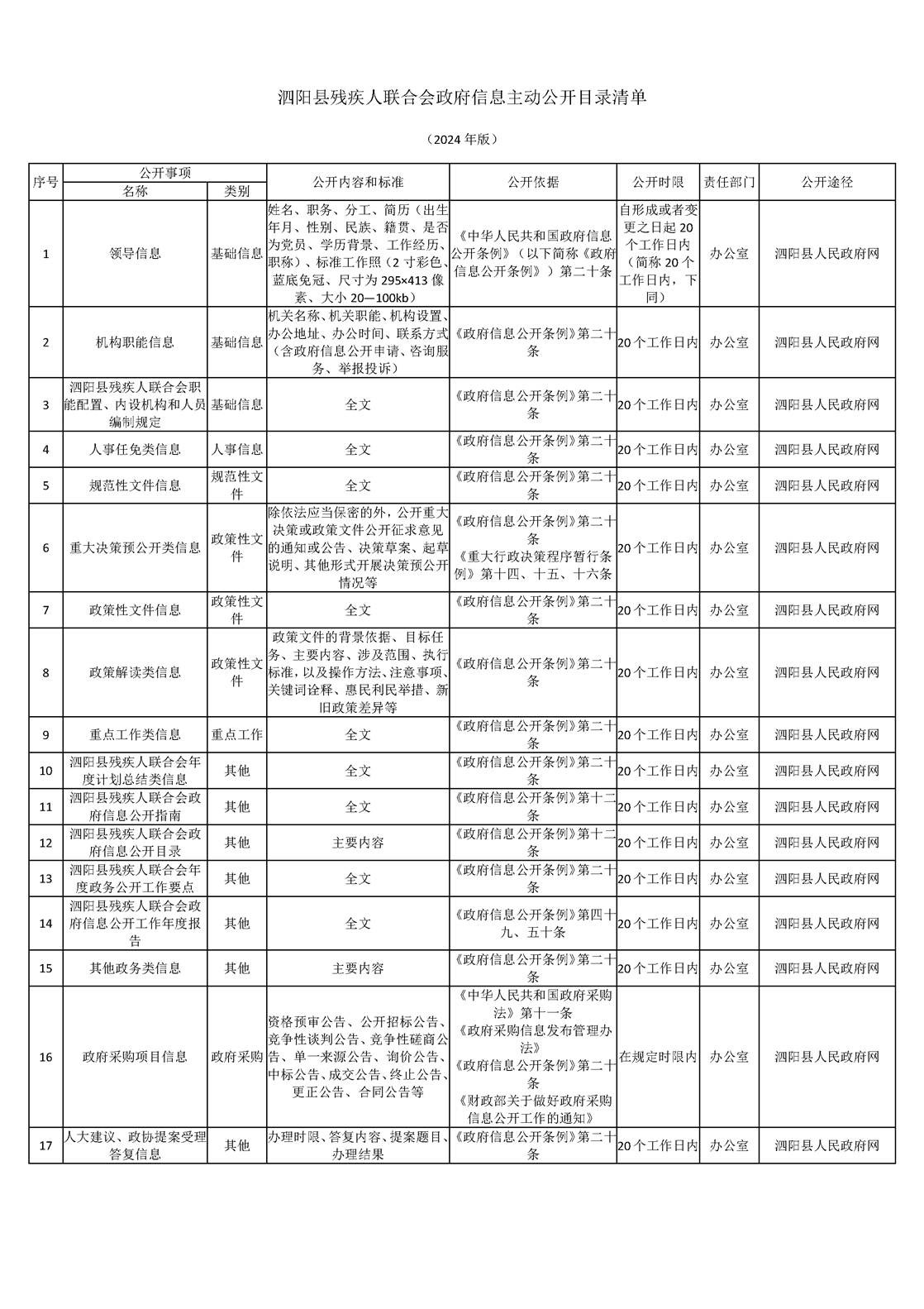泗陽縣殘疾人聯合會信息主動公開目錄清單(2024年)