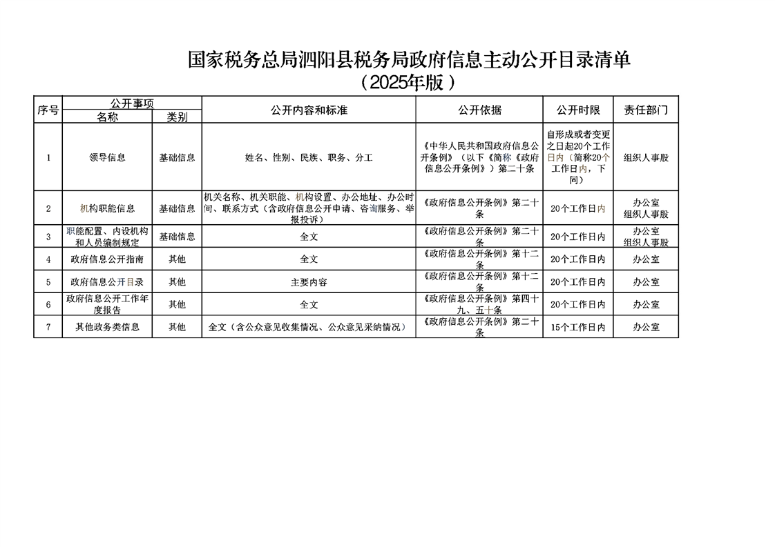 國家稅務總局泗陽縣稅務局政府信息主動公開目錄清單(2025年版)