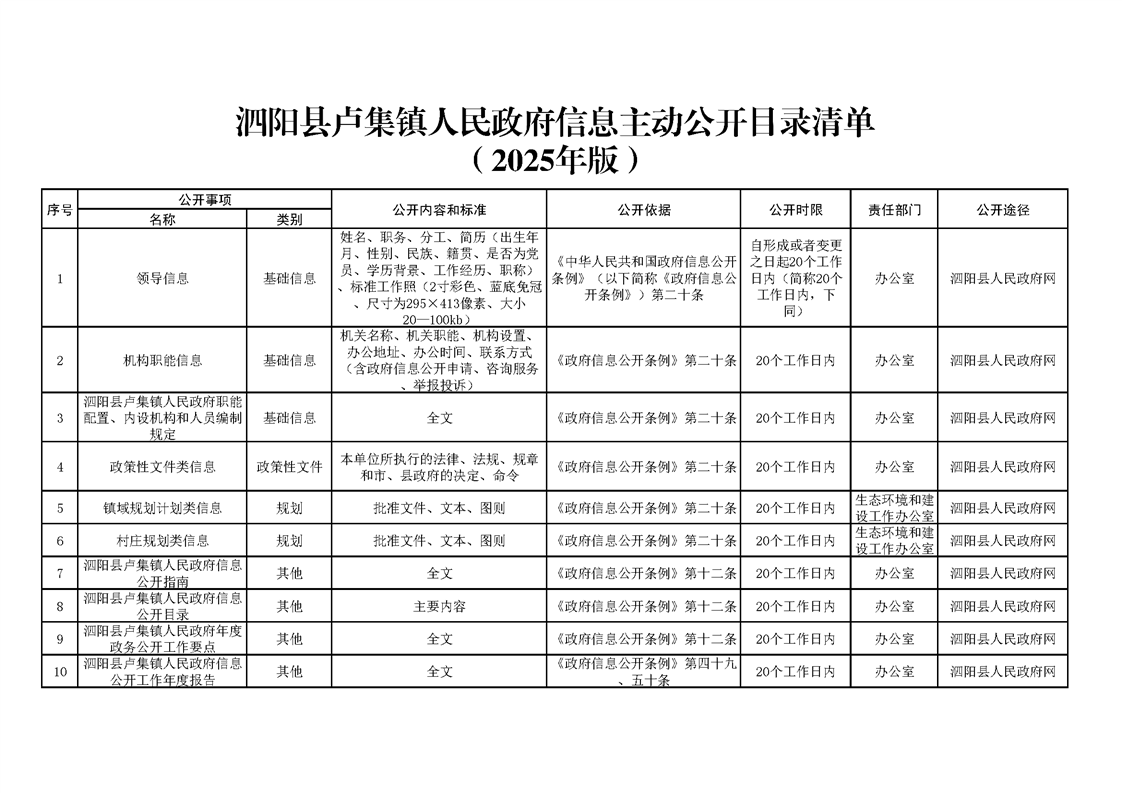 泗陽縣盧集鎮政府信息主動公開目錄清單(2025年版)