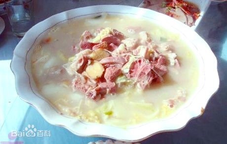 新袁羊肉是江蘇的一道漢族名菜。新袁,清初稱仁和鎮(zhèn)。當(dāng)年乾隆皇帝下江南,途經(jīng)京杭大運河新袁,時逢晌午,他即興下船,放眼望去,一幅“風(fēng)吹草低見牛羊”的畫面,頓感心曠神怡,決定在此“進膳”。地方官吏令名廚烹制一道色味鮮美的當(dāng)?shù)厣窖蛉猥I上。乾隆帝品嘗后大悅,脫口而出:“此乃人間美食,仁和羊肉甲天下也。”從此,新袁羊肉作為貢品進貢朝廷名揚天下,香飄四海。古鎮(zhèn)新袁也隨之名聲大振。新袁羊肉有“四絕”,一是質(zhì)優(yōu)味美;二是四季皆宜;三是食其系列;四是烹藝獨特。尤其是吃夏令羊肉才是新袁一絕。由于羊肉膻味較大,大部分地區(qū)一般在冬季吃羊肉,并佐以尖嘴椒、胡椒、生姜、蔥白等辛辣配料烹制。至于夏季,不要說吃,就是提到羊肉二字,似乎已覺膻味穿鼻。但在新袁,夏季吃羊肉已不是神話。香嫩適口的羊肉,你連半點膻味也嘗不出來。到新袁,只有嘗過夏令羊肉,才算不虛此行,更不要說“夏天羊肉能吃嗎”這類“外行話”。 提到“新袁羊肉”已經(jīng)不是簡單概念的“肉”了,而是“羊系列”。從羊頭吃起,羊口條、羊腦、羊眼、羊血、羊排骨、羊肉、羊肝、羊肚、羊心、羊肺、羊腸、羊腿、羊球,可以說是從頭吃到尾,再經(jīng)過燒、炒、爆、燉、冷熗等做法,“羊系列”已有30多道。