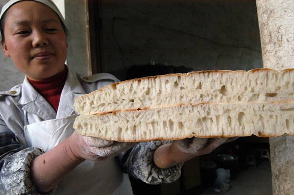 餅大而厚,中間厚度可達八寸,重達十五斤。穿城大餅烙制技術(shù)特殊也特殊,烙制大餅不用平底鍋,用的是圓底鐵鍋,烙出的餅才能中間厚邊口薄些。烙的火必須用木柴文火,所以一塊餅從入鍋到烙熟,得三柱香的工夫。烙餅人必須有耐心,才能達到餅熟而不焦的效果。穿城流傳俗語叫"性急烙不得大餅"。