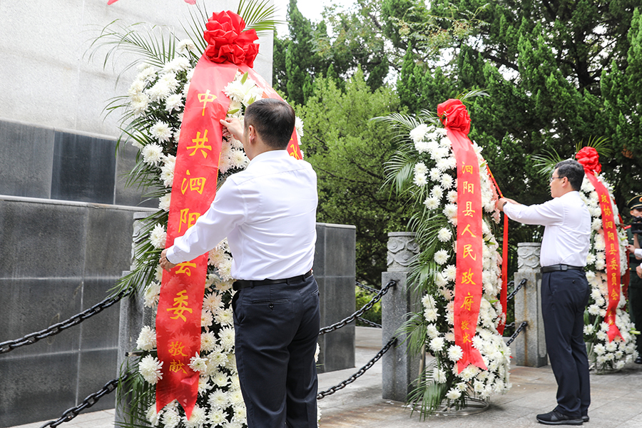 范德珩、王光宇、史素珍、魏國等縣領(lǐng)導(dǎo)上前整理花籃緞帶,向革命烈士表達崇高的敬意。