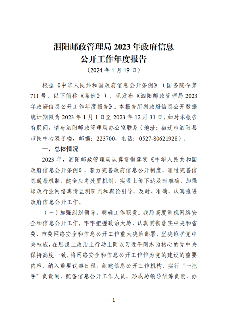 泗陽(yáng)郵政管理局2023年政府信息公開(kāi)工作年度報(bào)告