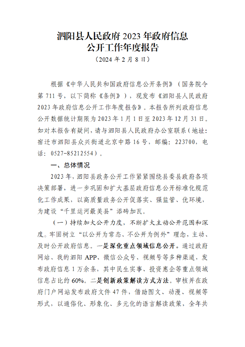 泗陽縣人民政府2023年政府信息公開工作年報