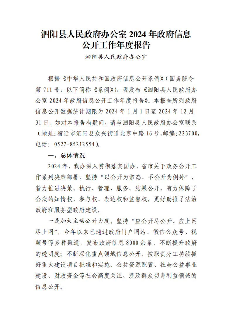 泗陽縣人民政府辦公室2024年政府信息公開工作年度報告
