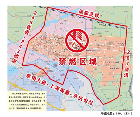 第五條 城區(qū)東至省道267,南至意楊大道—上海南路—京杭運(yùn)河,西至國(guó)道343—省道245,北至徐鹽高鐵合圍的區(qū)域內(nèi)(含以上道路、鐵路、橋、河流)為禁止燃放區(qū),除農(nóng)歷除夕、正月初一外,其他時(shí)間全天禁止燃放煙花爆竹。