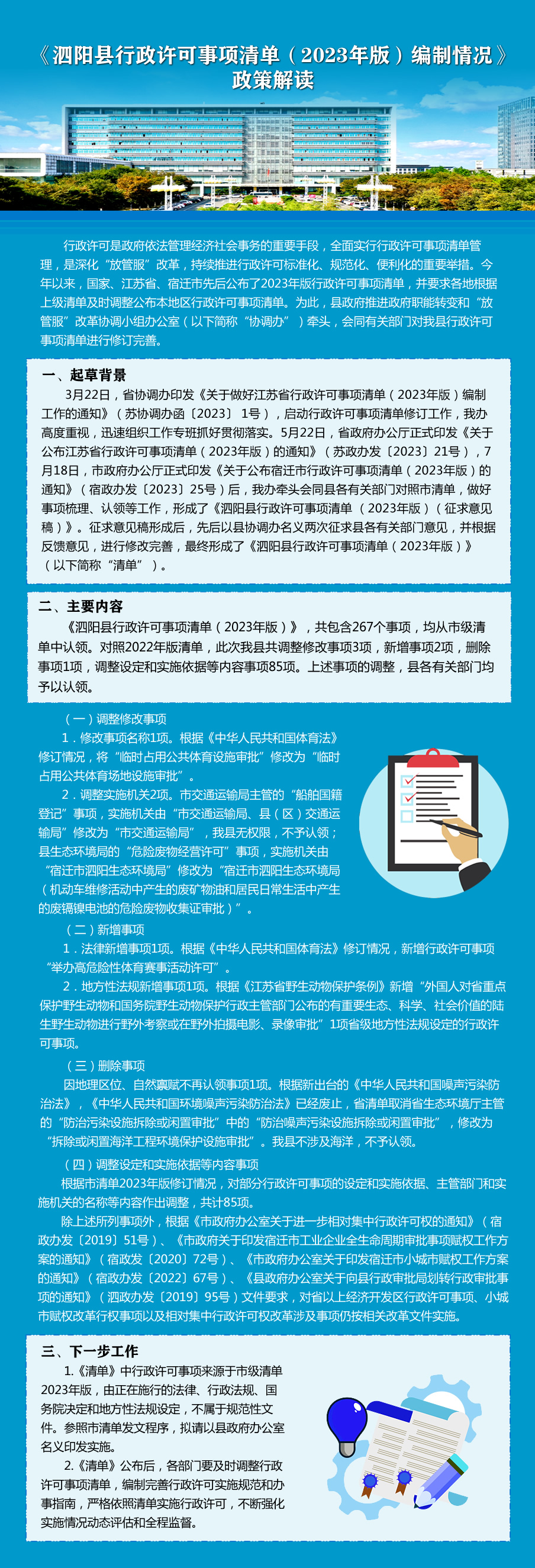 《泗陽縣行政許可事項(xiàng)清單(2023年版)》,共包含267個(gè)事項(xiàng),均從市級清單中認(rèn)領(lǐng)。對照2022年版清單,此次我縣共調(diào)整修改事項(xiàng)3項(xiàng),新增事項(xiàng)2項(xiàng),刪除事項(xiàng)1項(xiàng),調(diào)整設(shè)定和實(shí)施依據(jù)等內(nèi)容事項(xiàng)85項(xiàng)。上述事項(xiàng)的調(diào)整,縣各有關(guān)部門均予以認(rèn)領(lǐng)。