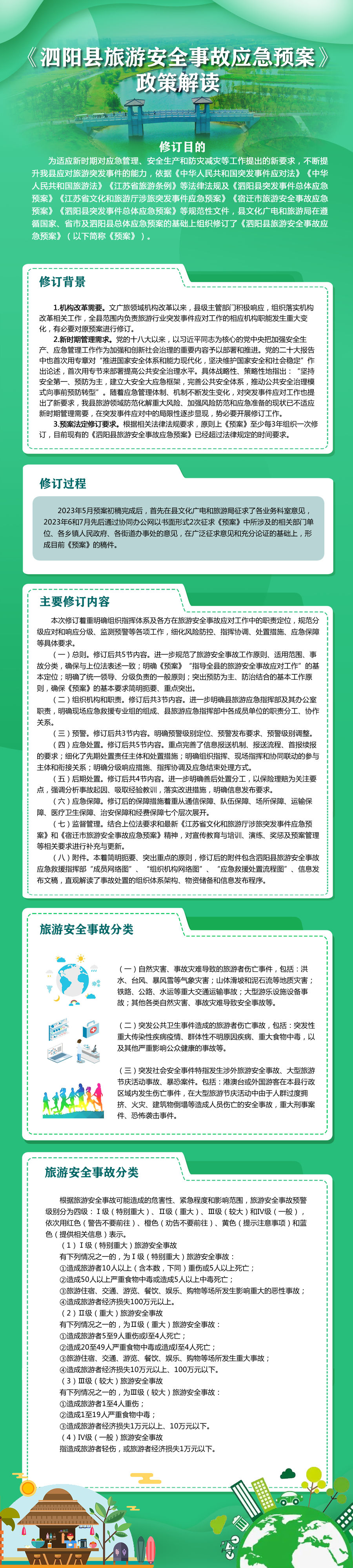 為適應新時期對應急管理、安全生產(chǎn)和防災減災等工作提出的新要求,不斷提升我縣應對旅游突發(fā)事件的能力,依據(jù)《中華人民共和國突發(fā)事件應對法》《中華人民共和國旅游法》《江蘇省旅游條例》等法律法規(guī)及《泗陽縣突發(fā)事件總體應急預案》《江蘇省文化和旅游廳涉旅突發(fā)事件應急預案》《宿遷市旅游安全事故應急預案》《泗陽縣突發(fā)事件總體應急預案》等規(guī)范性文件,縣文化廣電和旅游局在遵循國家、省市及泗陽縣總體應急預案的基礎上組織修訂了《泗陽縣旅游安全事故應急預案》(以下簡稱《預案》)。