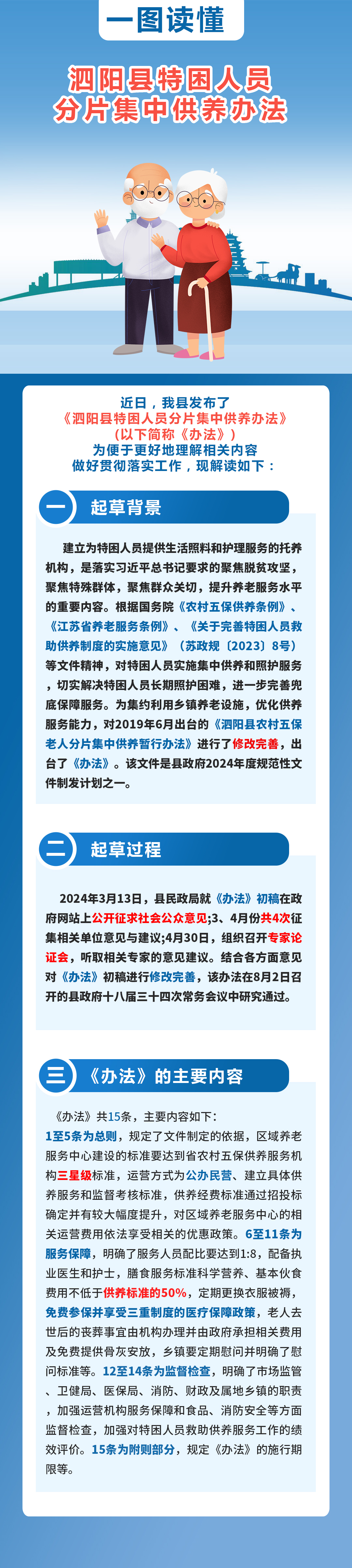 近日,我縣發布了《泗陽縣特困人員分片集中供養辦法》(以下簡稱《辦法》),為便于更好地理解相關內容,做好貫徹落實工作,現解讀如下: