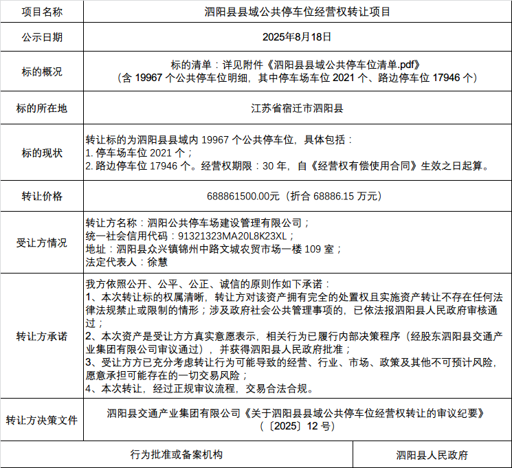 關于泗陽縣縣域公共停車位經營權轉讓公示