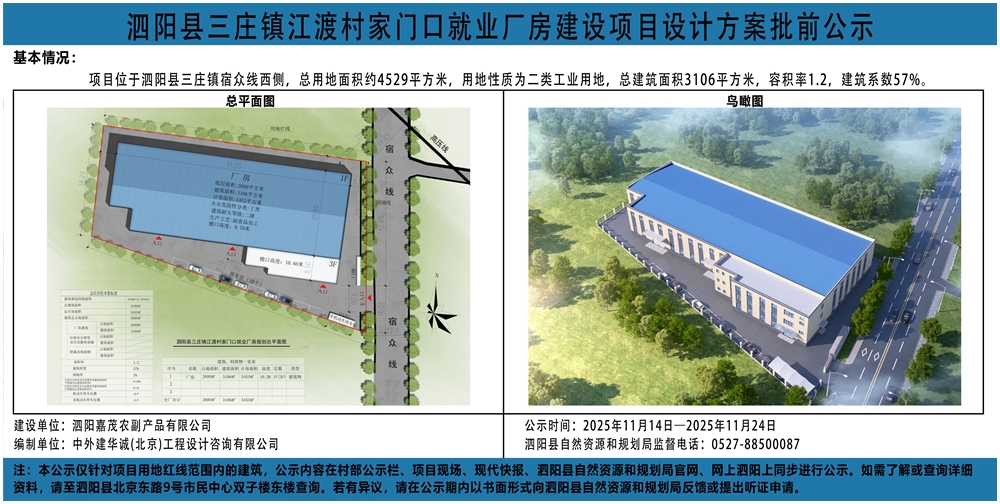 為了加強城市規劃的監督管理,強化公眾參與公眾監督,切實保障公共利益,根據《中華人民共和國城鄉規劃法》、《江蘇省城鄉規劃條例》等相關法律法規,現將位于三莊鎮宿眾線西側泗陽縣三莊鎮江渡村家門口就業廠房項目規劃方案予以批前公示,公示期為10日。
