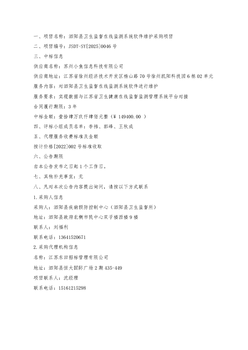泗陽縣衛生監督在線監測系統軟件維護采購項目成交結果公告