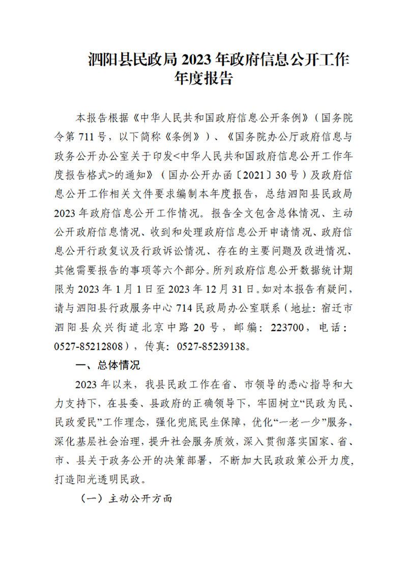 泗陽縣民政局2023年政府信息公開工作年度報告