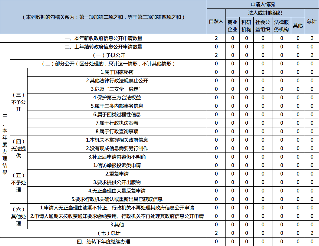 2022年,退役軍人事務局共受理政府信息公開申請2件,均已辦結。政府信息公開收費標準按照《國務院辦公廳關于印發<政府信息公開信息處理費管理辦法>的通知》執行。