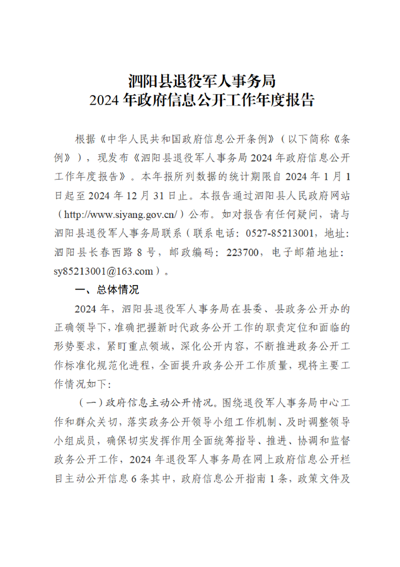 泗陽縣退役軍人事務(wù)局2024年度政府信息公開工作年度報告