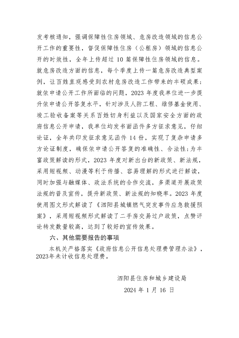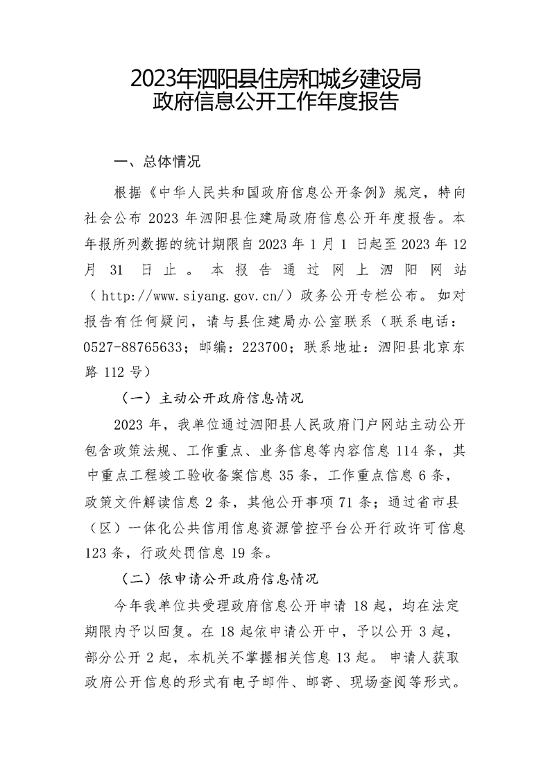 泗陽縣住房和城鄉建設局2023年政府信息公開工作年度報告
